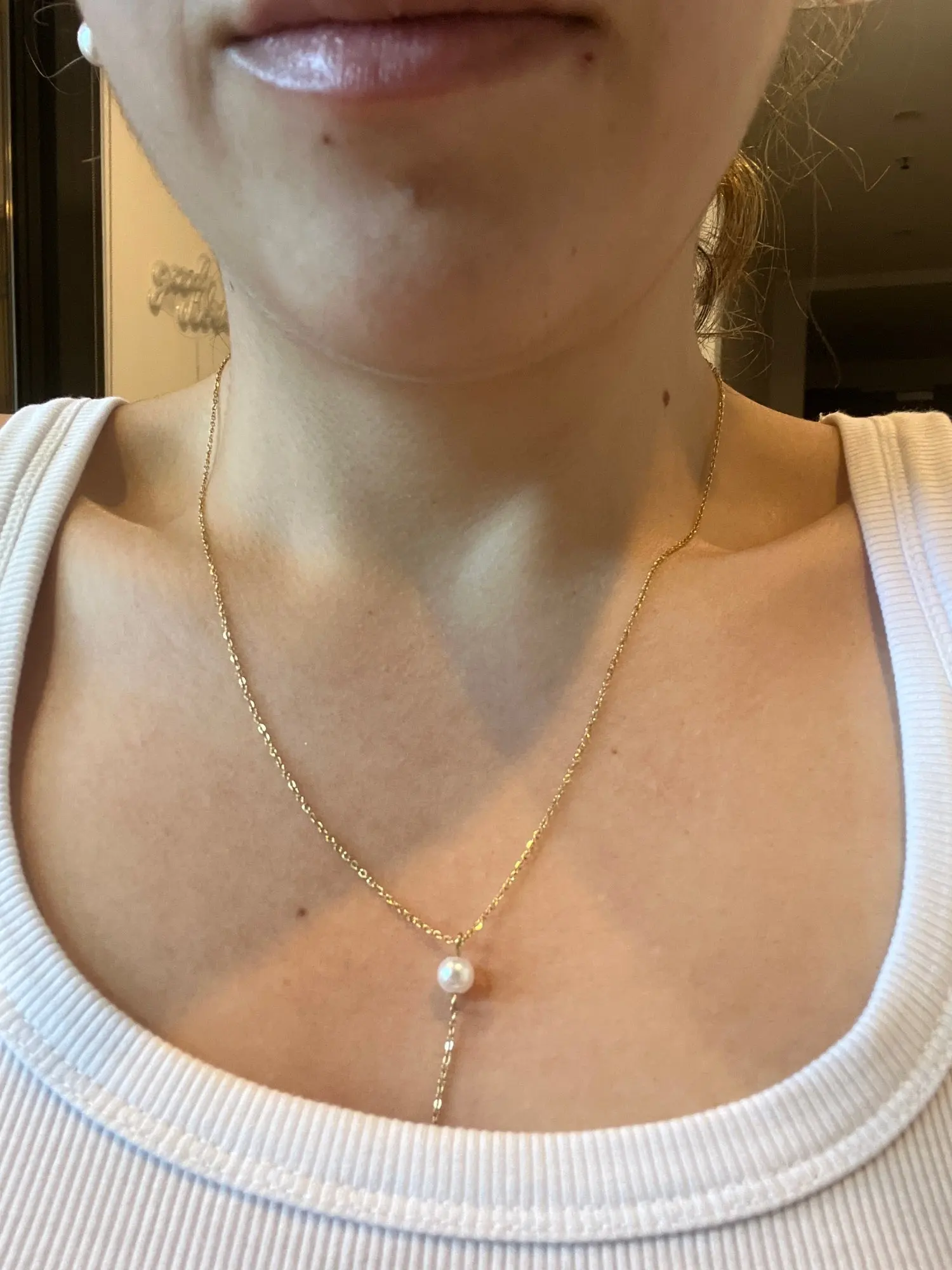 Featuring a dainty gold-plated chain adorned with luminous freshwater pearls, this lariat-style necklace drapes gracefully to accentuate your neckline. Perfect for layering or wearing solo, it's an essential piece for both casual and formal occasions.