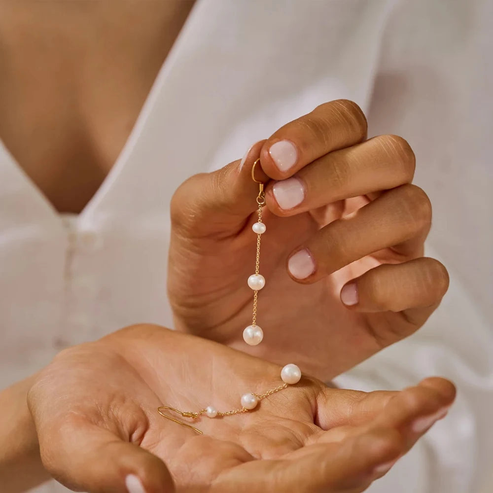 Designed to sway gracefully with every movement, these delicate earrings feature a cascading row of luminous freshwater pearls suspended from a fine chain. Perfect for adding a touch of sophistication to both casual and formal outfits.
